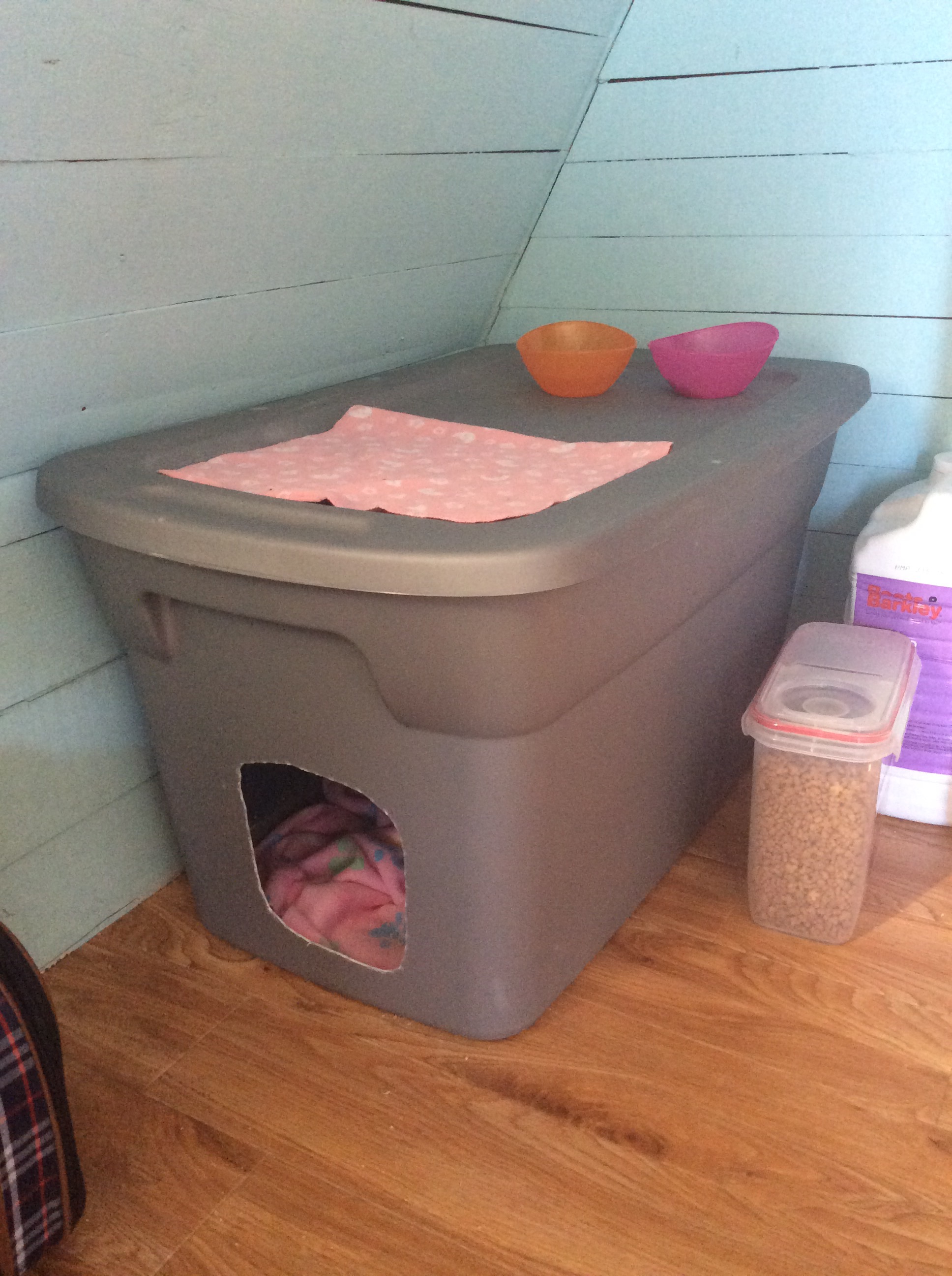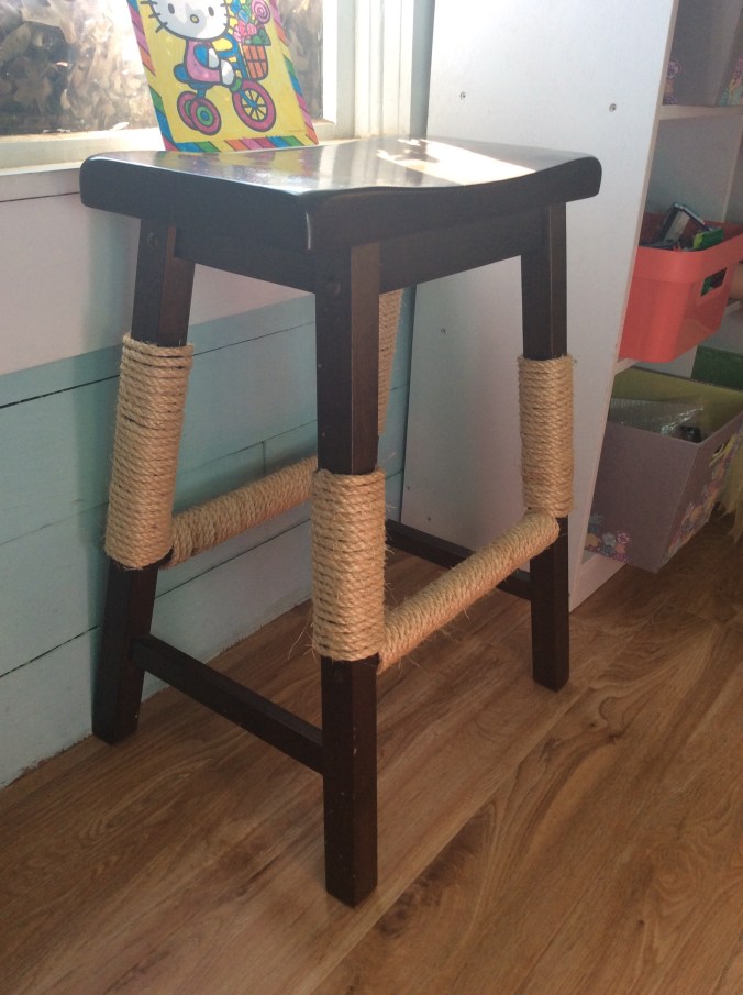 This way, minimal litter is tracked out, sight and smell is contained, access is limited and the feeding area is provided on the top! Pretty slick, eh? We also crafted a tower/window perch out of an extra barstool we had. I think we will be adding carpet to the top for additional scratching.