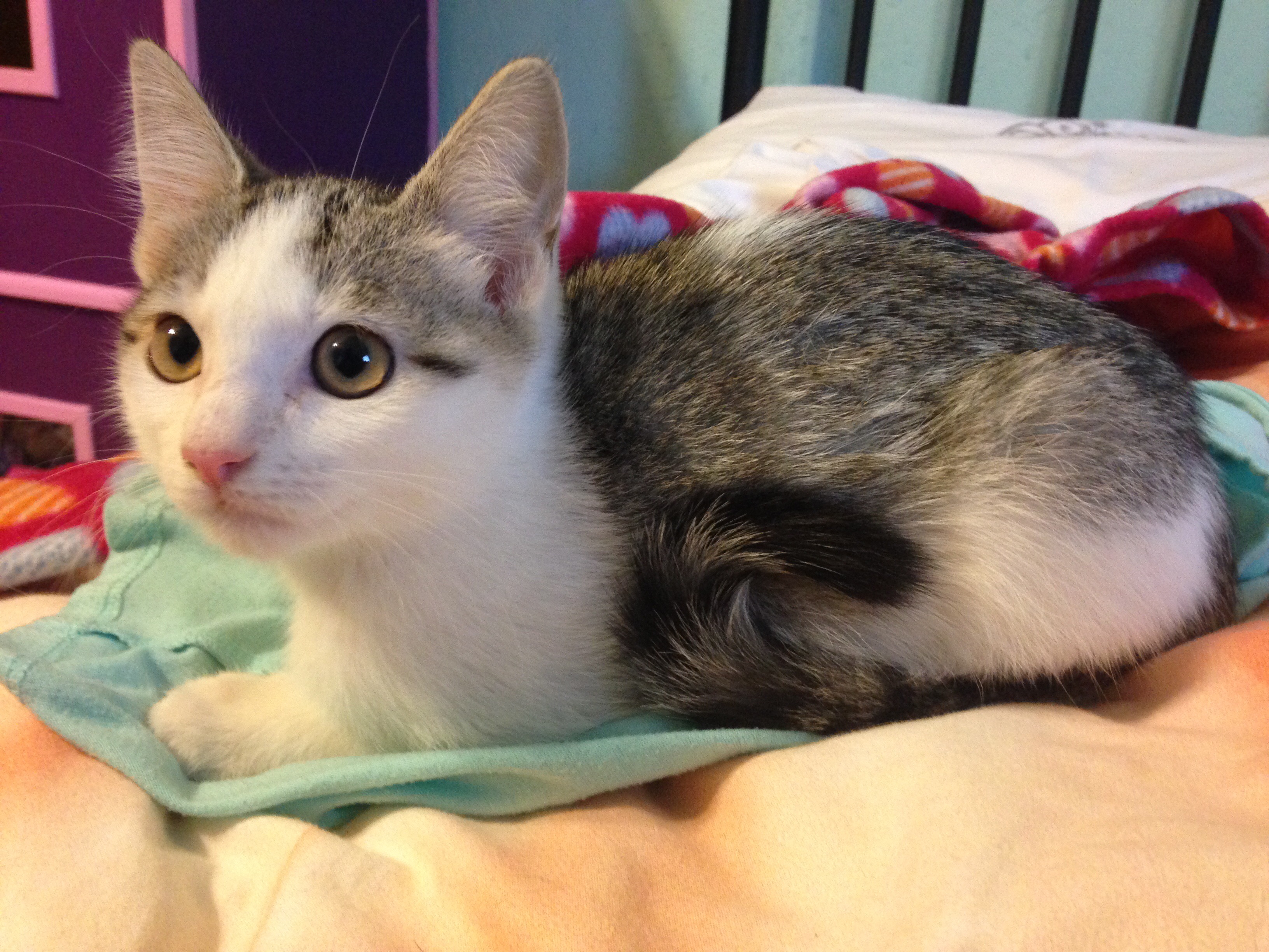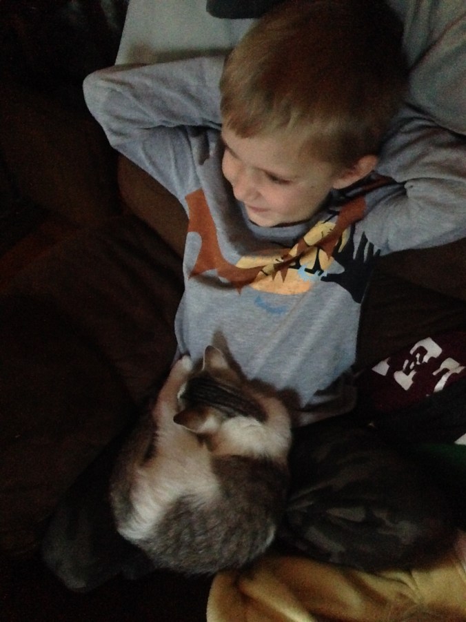 Although, he does sleep with Ashlyn every night. Skye (our dog that was raised around cats) has been great. Fluffy is coming around little by little. He doesn’t “play” with her yet like she would like for him to, but he will be in a room with her now and not get all hissy. Baby steps!