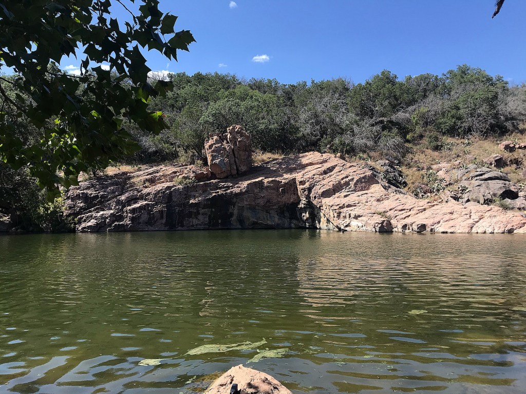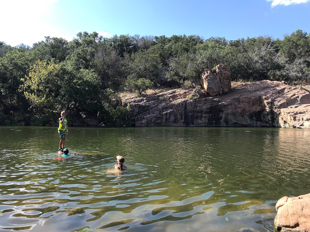 We finally made it to a more reliable swimming spot coined the Devilβs Waterhole. The rock formations and cliff sides surrounding the narrow corner of the lake were stunning! The water, however, left a bit to be desired for me haha. The clarity was decent enough, but the globs of weeds? pond scum? sludge?….not quite sure what it was… kept drifting by and I wasnβt hot enough to swim with it. I guess the kids were though! They just swam around the chunks and found a good perching rock. We were able to witness one person jump from the highest point of the cliff and it got Westonβs attention, but we decided best to save that for the next day.