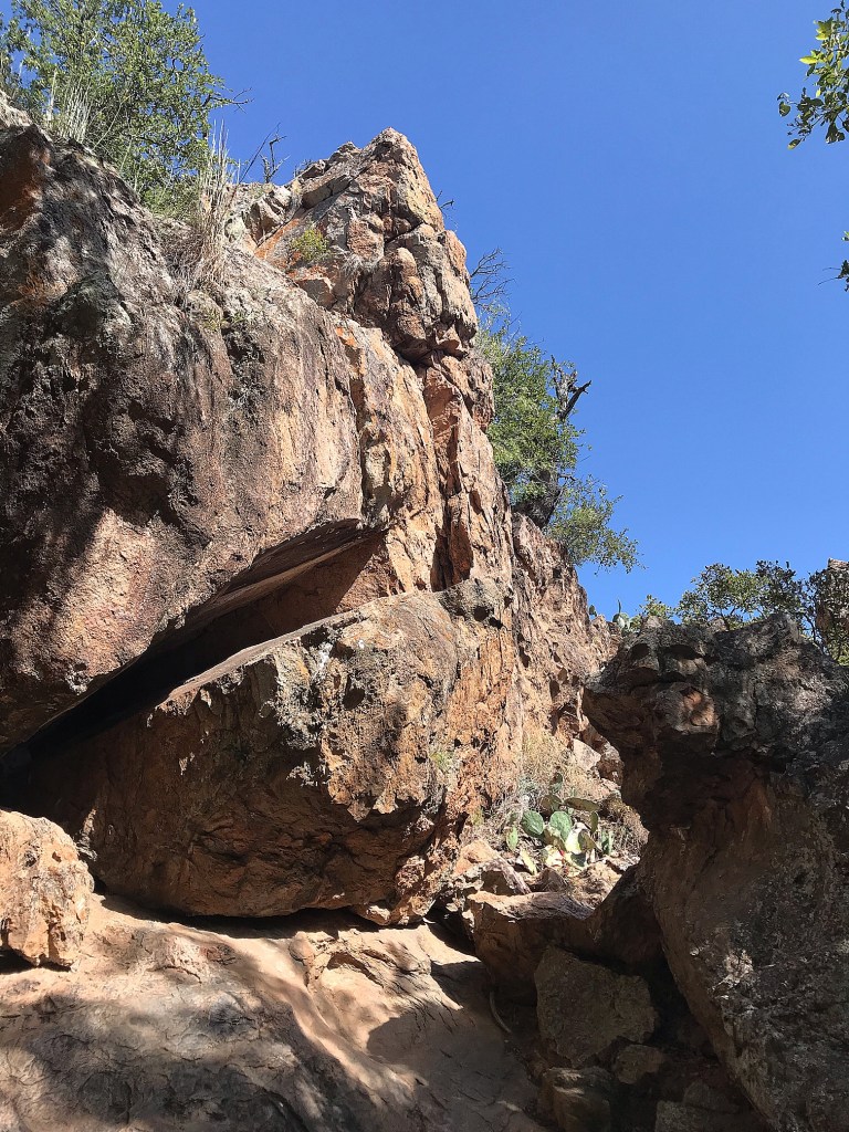 Once we were popped up we headed across the camping loop to the trail head for The Devilβs Waterhole. Along the way we were distracted down/up another trail to take in a large section of Gneiss (pronounced nice, thanks for reading that plaque Ashlyn!) rocks and ended up in the dried up bed of Spring Creek that feeds into the lake. Apparently when itβs flowing, the area is a beautiful waterfall and lovely to swim in!