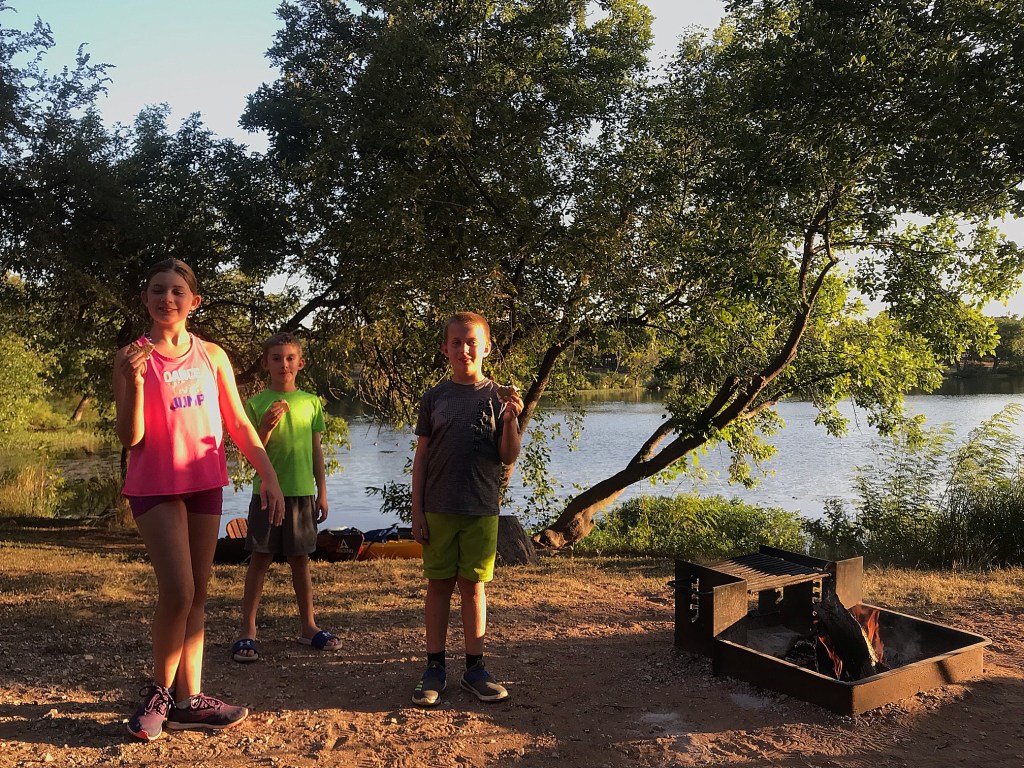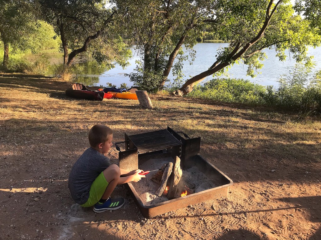 Later, Archer gave kayaking in our cove a go and found it kind of meh. Weston and I went back out before dinner to look at another fishing pier. We were really loving that launch site! The boys waded around chasing minnows until dinner and then Weston built a fire for our sβmores. The rest of the relaxing evening was spent watching the fire and the water until it got dark and Archer was ready for bed. The 3 of us opted to sit in the dark and wait the fire out…until a skunk showed up and started digging through our not yet thrown out trash! π Once our light hit him and we realized what he was, it was a race of who ran from who faster! Lol After he stayed away for a minute or 2, I retrieved the bag and sent it to the dumpster. Archer was a little bummed he missed the chaos haha.