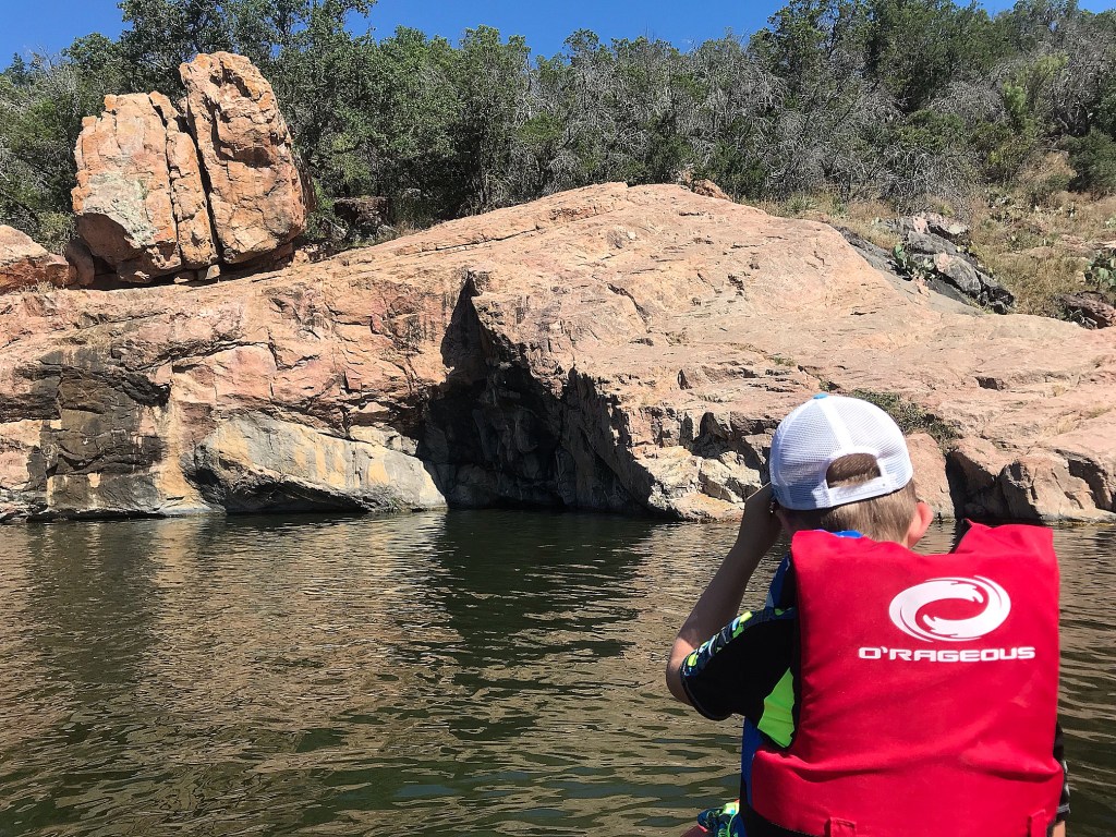 The next morning after some bacon, eggs and biscuits Ashlyn, Weston and myself hopped on the kayaks while Archer and Sally lounged in the AC of the camper. We paddled around the corner back to the Devilβs Waterhole and up into the narrows as far as we could. Weston hopped off and attempted climbing up the cliff side to jump, but couldnβt get a good grip on the slippery rock in a bulky life jacket and I wasnβt ready for him to jump without one. Another time. They both enjoyed more swim time before we paddled back for lunch.