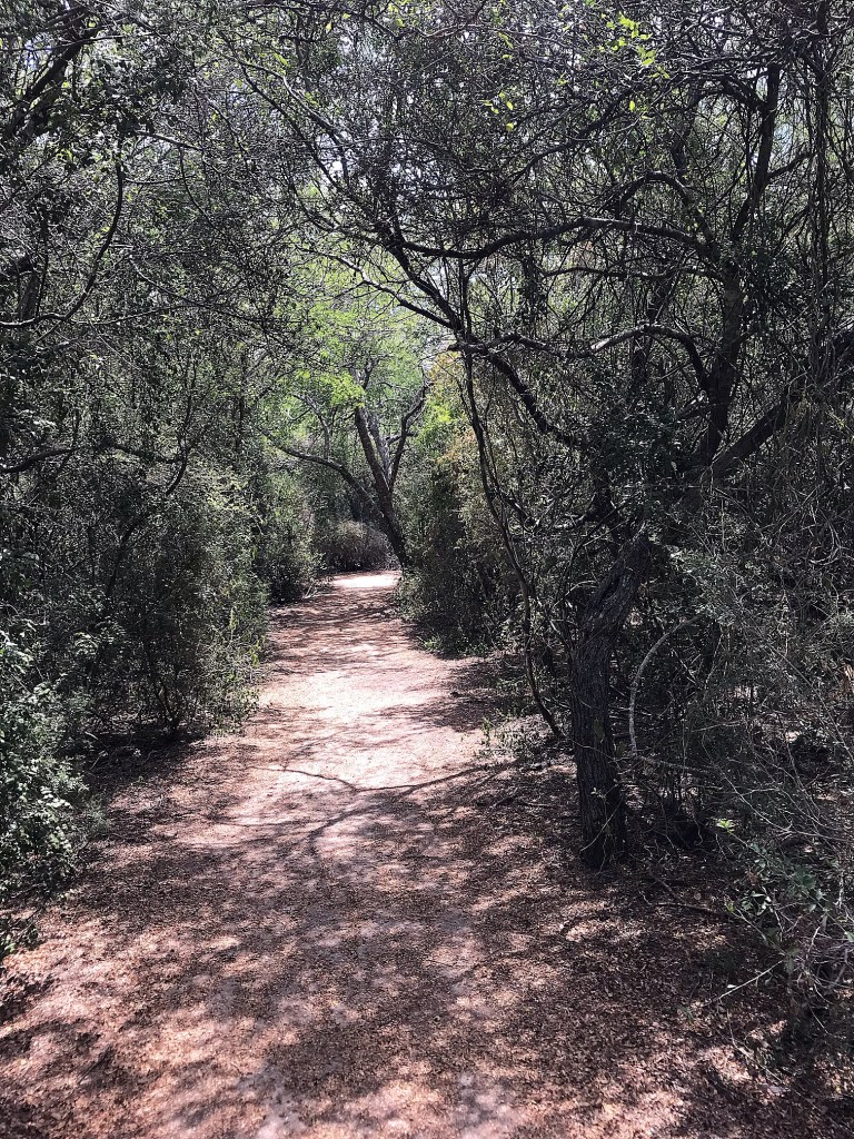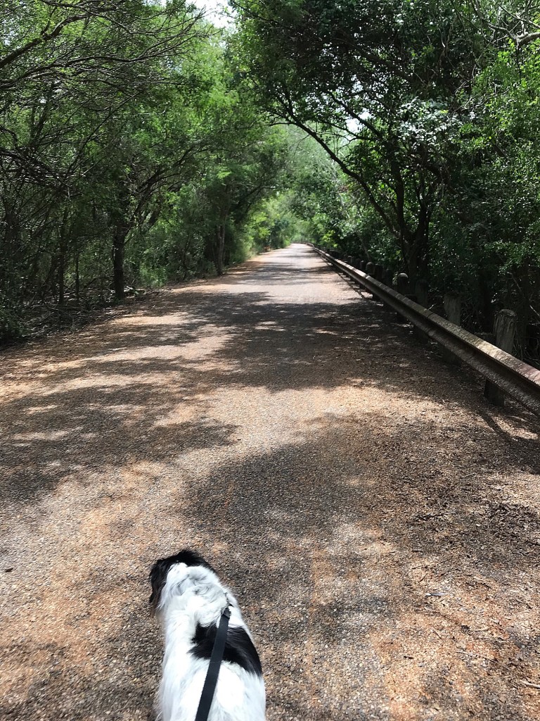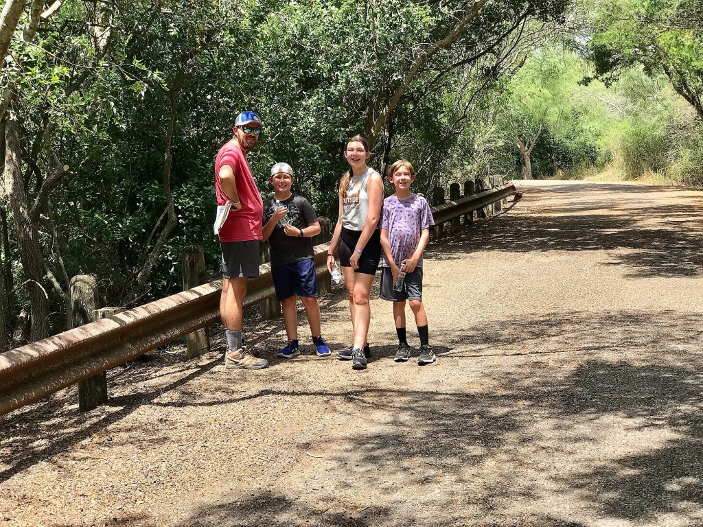 We set off down the main paved road loop that crosses the resaca a number of times and links to other gravel trail hikes throughout the park. Resaca is the regions given name for the channels or oxbow lakes created by the Rio Grande. The main resaca in this park was dry at the time, but a ranger said it would fill again once the rain returns. Keeping aware of the pavement temperature and increasing lack of shade, we made it as far as the first crossing on the resaca and decided we had seen enough.