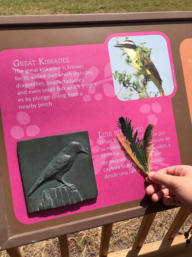 Once back at headquarters, Ashlyn and I wanted to do the quick trail that would take us out on the decks we saw from the main trail, but Sally was pretty worn out already. We hadn’t taken her out on the road much this summer and we could tell she was feeling out of shape. The guys stayed in the shade with her while Ashlyn and I zipped down the very cool and easy trail. We kept seeing scatterings of feathers along the trail and concluded that the birds must enjoy roosting and possibly dust bathing in that area. Ashlyn collected a few vibrant colored feathers and the signs at the end of the trail were quite helpful for identification.