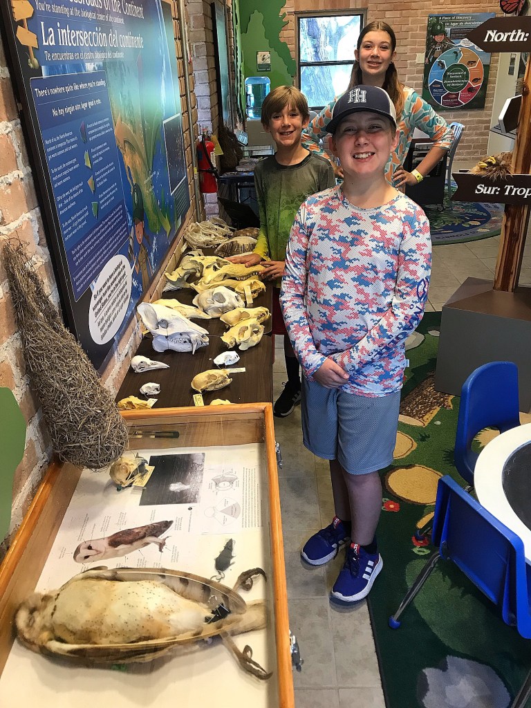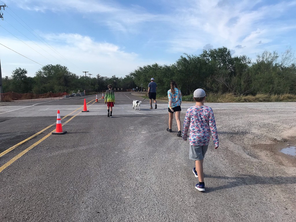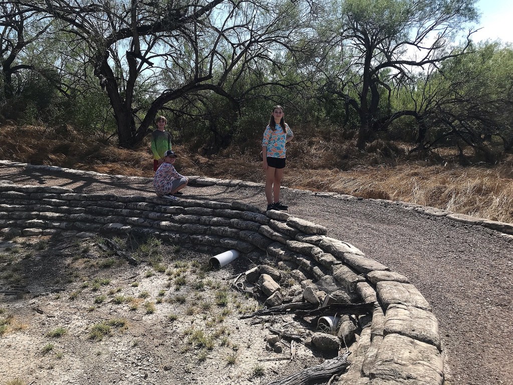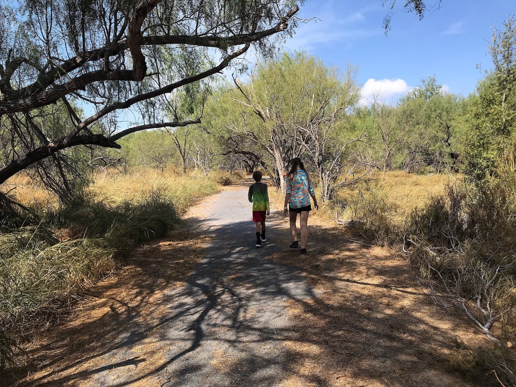 After check-in, we set off across a bridge over an irrigation ditch and were surprised that we would be on the other side of the “the wall” in this park. Around the corner we came to the old headquarters building that is now being used as a nature center. We were told the tram was running today and starts at this location circling around every hour. But, no dogs allowed on it. Since the trailhead for the 2 mile loop hike for the Rio Grande would be an additional 3 mile roundtrip for us to get to, Nathan opted to hang out with Sally at the shaded pavilion while the kids and I zipped off to the trailhead on the tram.