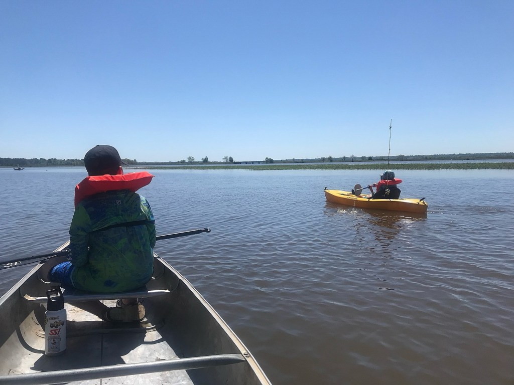 On day 3 our faith in the forecast was rewarded and it was a beautifully sunny and warm day. Since we still only own 2 kayaks, we went to headquarters to rent a double kayak and 3 life jackets since I learned last minute that Ashlyn’s lifejacket was the only one in good shape/fit. We were surprised to learn that since the double kayak only seated 2 people, they would only loan 2 lifejackets and paying to rent additional lifejackets isn’t an option. HOWEVER, their canoes are rated for 4 people and we could get up to 4 jackets included in that rental. OK. Seemed to me this was far more complicated than it needed to be, but I was also the person short on life jackets. Beggars can’t be choosers, right? So that day, the boys and I learned how to operate a canoe haha! The launch area was located in a narrow slough section of the paddling trail and all of the kayaks and canoes were already set up along the shore ready to be launched. With a little creativity, we got our kayaks over to the site and were ready to go!